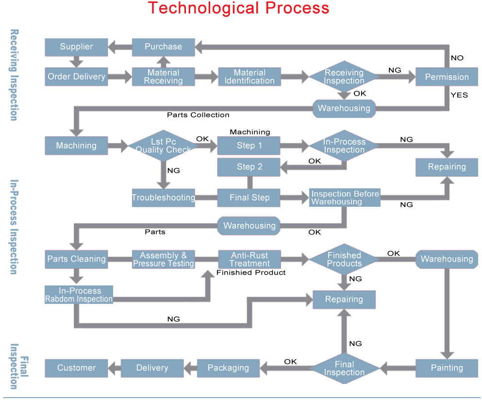 Blanks: All casting suppliers shall have the ISO9000 certificate. Before batch production, All casting poured by new partners shall passed “casting procedure Qualification”, and X-ray detecting shall meet with requirement of ANSI B16.34 standard.Before putting in storage, All casting sample shall be inspected, Dimension-Examined.Leland will make an auditing to all castings supplier per year according to ISO9000 standard.All casting used for special media or PN≥900Lb(15.0MPa) shall be conducted NDT(such as RT, PT and MT).